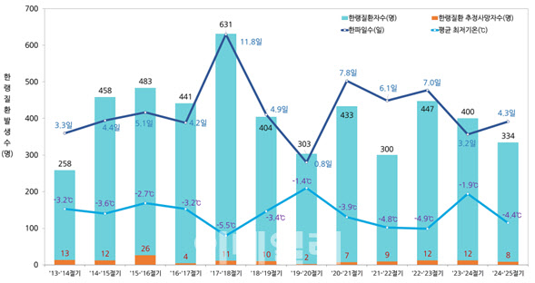 [이데일리 안치영 기자] 지난해 겨울철에 동상·저체온증 등 한랭질환을 겪은 환자가 총 334명인 것으로 나타났다. 특히 고령층 피해가 컸는데 한파 시 야외활동을 자제하고 평상시 보
