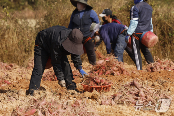 5일 전남 영암군 신북면 한 황토고구마밭에서 농민들rhk 계절근로자들이 고구마 수확에 한창이다.사진은 기사 내용과 무관함/뉴스1 News1…