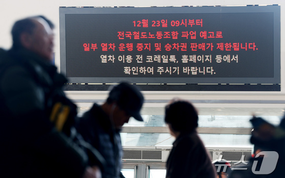 전국철도노동조합철도노조 총파업을 하루 앞둔 22일 서울역에 파업 관련 안내문이 전광판에 나타나고 있다. News1 황기선 기자…