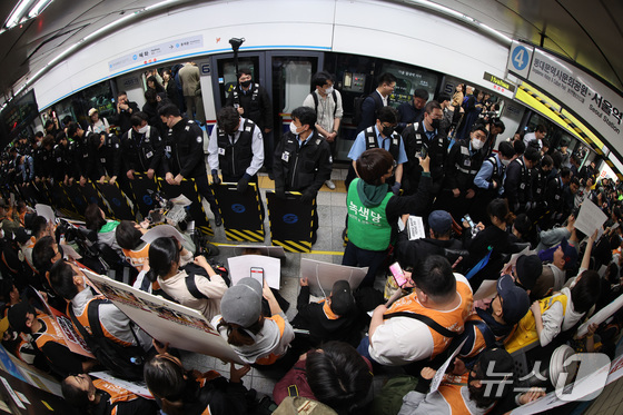 서울 지하철 4호선 혜화역 동대문 방면 승강장에서 열린 제62차 '출근길 지하철 탑니다' 시위에서 전국장애인차별철폐연대전장연 회원들이 경찰·서울교통공사…