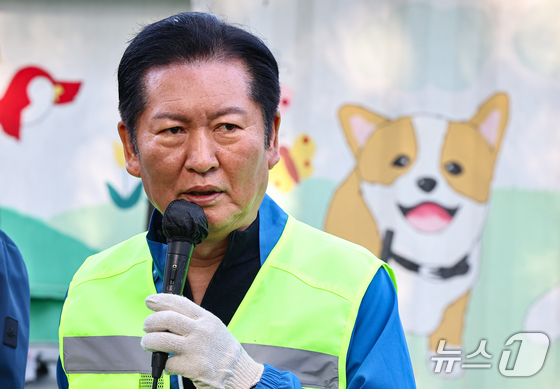 정청래 더불어민주당 대표가 9일 용인시 처인구의 한 유기견 보호소를 봉사활동차 방문해 인사말을 하고 있다. 2025.11.9/뉴스1 News1 김도우 기자…