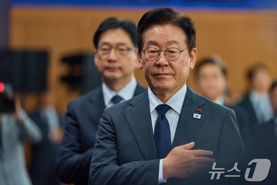 이재명 대통령이 지난 5일 충남 천안시 한국기술교육대학교에서 열린 '충남의 마음을 듣다' 타운홀미팅에서 국민의례를 하고 있다.대통령실 제공. 재판매 및 DB 금…