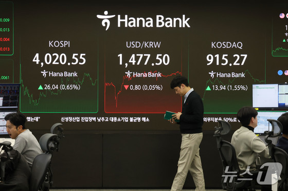 코스피가 지난 19일 서울 중구 하나은행 딜링룸 현황판에 전일 대비 26.04포인트0.65%상승한 4,020.55를 나타내고 있다. 2025.12.19…