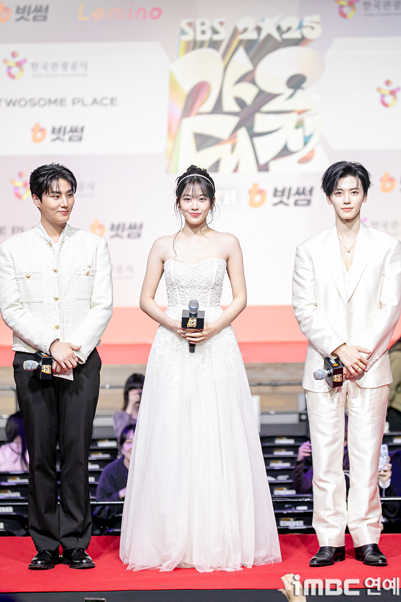 데이식스 영케이, 아이브 안유진, NCT DREAM 재민이 25일 오후 인천 영종도 인스파이어에서 열린 2025 SBS 가요대전 시상식 레드카펫 행사에 참석해 포즈를 취하고 있다.