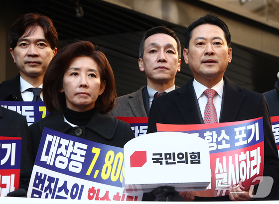장동혁 국민의힘 대표를 비롯한 의원들이 19일 오전 대장동 개발사업 특혜 의혹 사건에서 실형을 선고 받은 남욱 변호사가 추징보전 해제를 요구한 서울 강남구 청담동의 한 …
