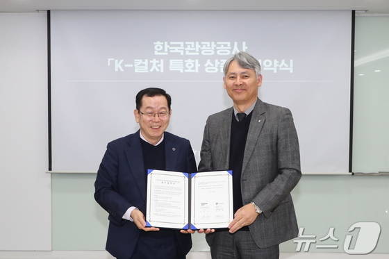 K-컬처 특화 상품 운영사 업무 협약식. 김종훈 한국관광공사 국제관광본부장 직무대리왼쪽, 김응수 프리미엄패스인터내셔널 대표한국관광공사 제공…