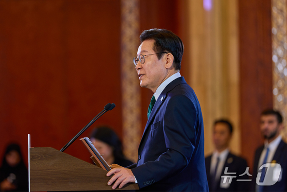 아랍에미리트UAE를 국빈 방문한 이재명 대통령이 17일현지 시간 아부다비의 한 호텔에서 열린 동포 만찬 간담회에서 인사말을 하고 있다…