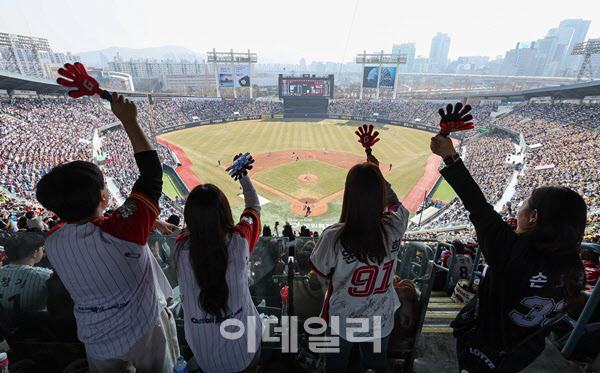 22일 서울 송파구 잠실야구장에서 열린 ‘2025 신한 SOL 뱅크 KBO리그’ 개막전 롯데 자이언츠와 LG 트윈스의 경기를 찾은 야구팬들이 경기를 관람하고 있다. [이데일리 송영