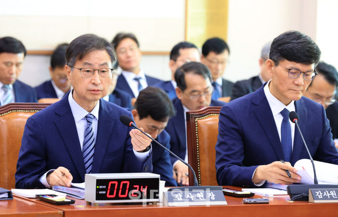 최재해 감사원장이 16일 국회 법제사법위원회에서 열린 감사원 등에 대한 국정감사에 출석, 질의에 답변하고 있다. 우측은 정상우 사무총장. (사진=노진환 기자) [이데일리 한광범 기