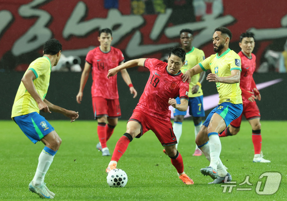 일 서울월드컵경기장에서 열린 하나은행 초청 축구국가대표팀 친선경기 대한민국과 브라질의 경기, 전반전 대한민국 이강인이 돌파하고 있다. ../뉴스 c…