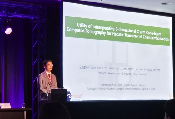 전성훈 해마루동물병원 인터벤션센터장이 최근 스페인 바르셀로나에서 열린 유럽수의방사선학회에서 차원 혈관조영술을 이용한 반려동물 간암 색전술 성과를 발표하고 있다…