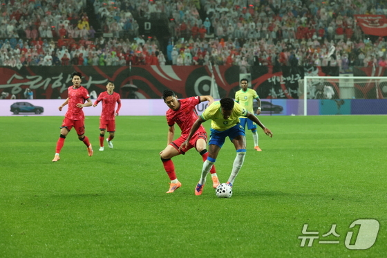 일 서울월드컵경기장에서 열린 하나은행 초청 축구국가대표팀 친선경기 대한민국과 브라질의 경기, 전반전 대한민국 이강인이 돌파하고 있다. ../뉴스 c…