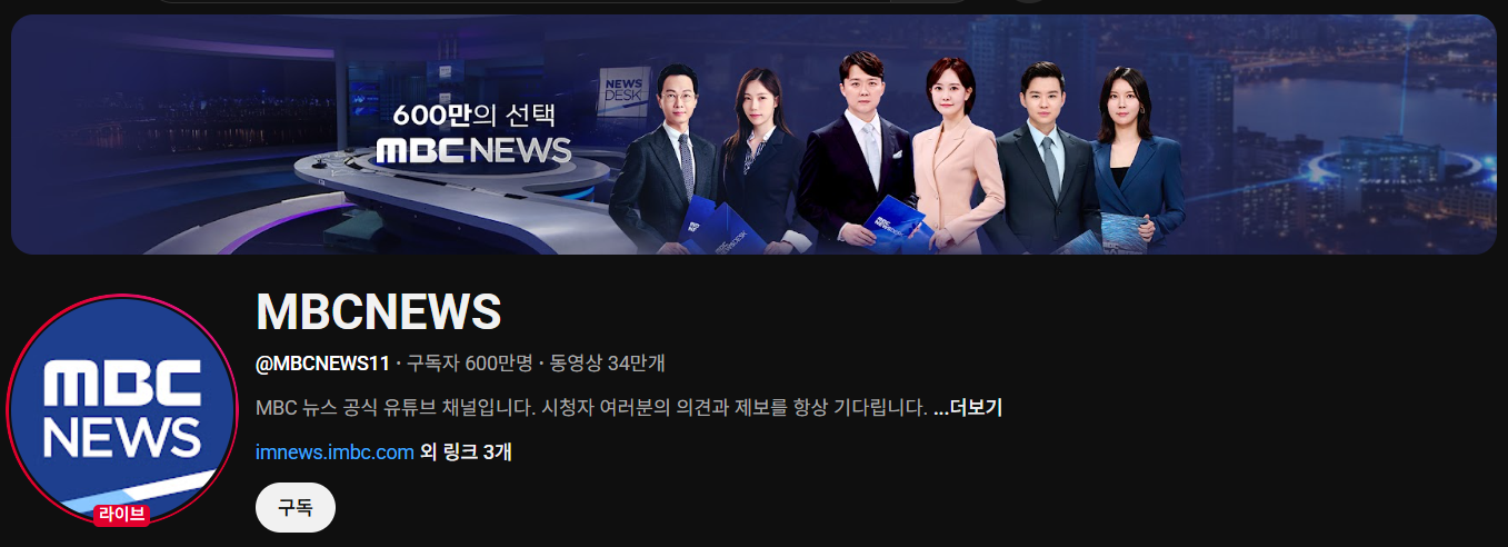 MBC가 국내 방송사 가운데 처음으로 유튜브 뉴스채널 구독자 600만 명을 돌파했다. MBC는 “10월 7일 기준으로 유튜브 ‘MBCNEWS’ 채널 구독자가 600만 명을 넘어섰으