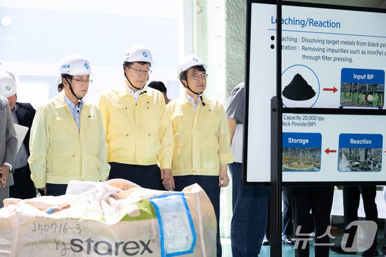 김성환 기후에너지환경부 장관이 전북 군산시 새만금국가산업단지 성일하이텍을 방문, 전기차 폐배터리 자원순환체계 현황 등을 점검하고 있다. 환경부 제공. 재판매 및…